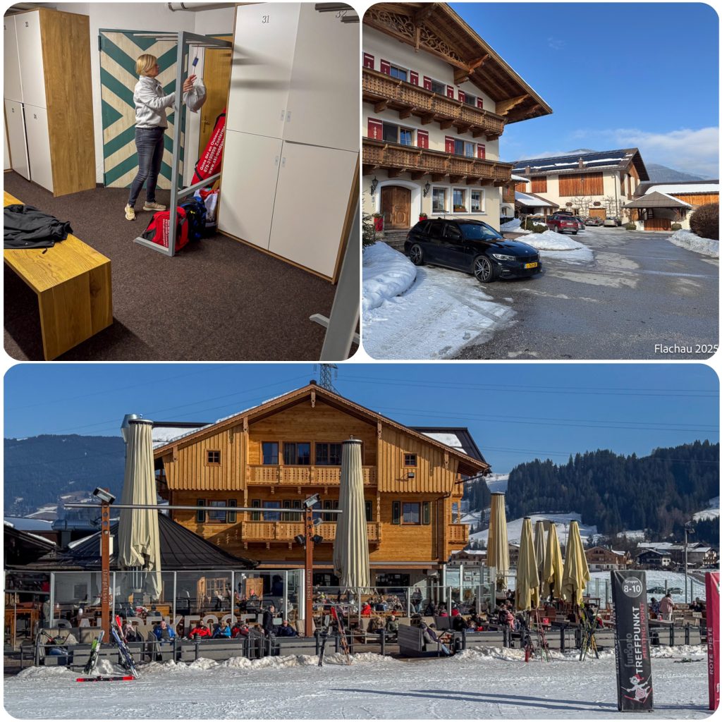 Echt relax dit. Op het gemak pakken Simone en ik de auto in en leggen de skispullen in het kachelhok. Daarna lopen we op het gemak naar de DK. De zon schijnt weer volop en om 11:00 uur strijken we neer aan een tafeltje. Het is wisseldag en rustig. Het personeel heeft tijd en degene die we al wat jaartjes kennen komen een praatje maken.